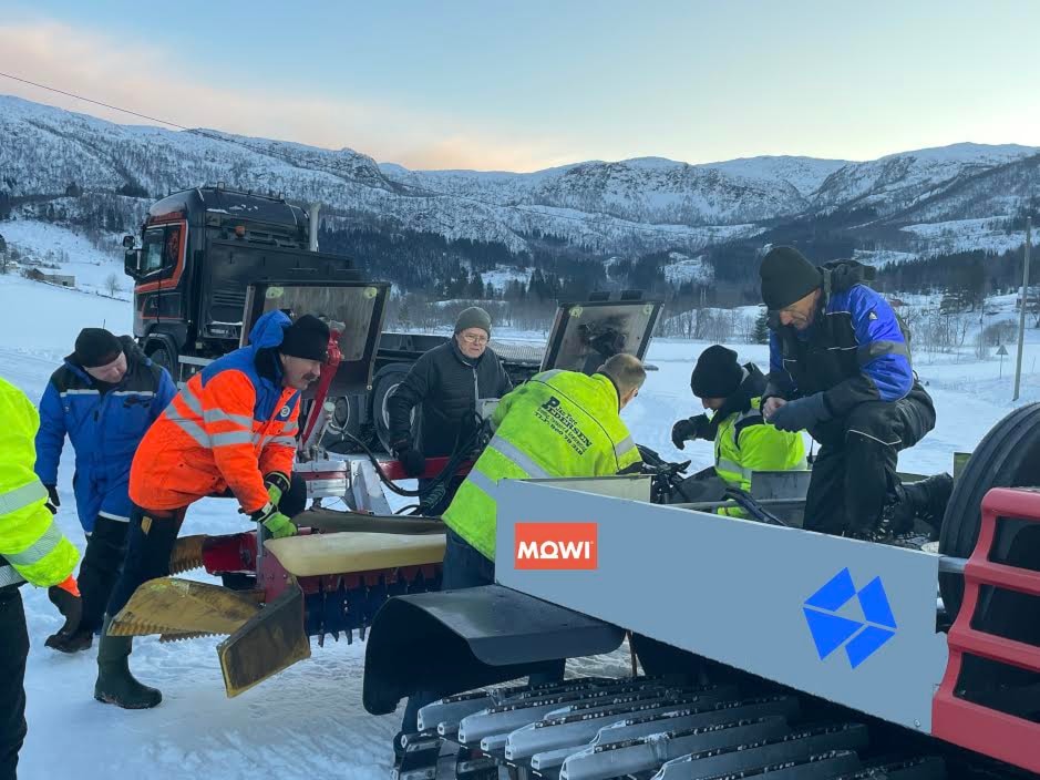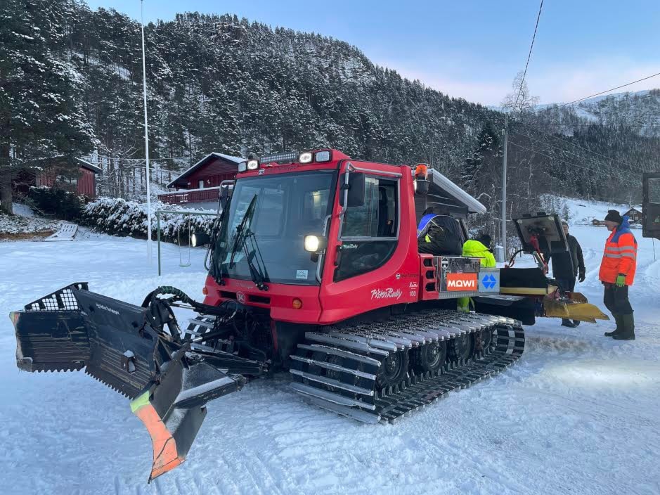 KLARGJERING: Ivrige løypekøyrarar i sving med å gjere maskina klar til prøvekøyring.
